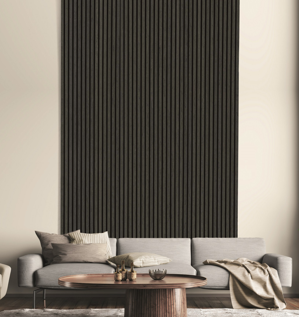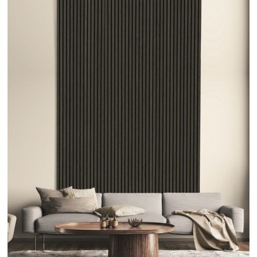 A sötétszürke tölgy furnéros acustico falpanel elegáns, sötétszürke tölgy furnér felületű falburkolat, amely javítja a helyiség akusztikáját és megjelenését. Ideális nappaliba, hálószobába, irodába vagy közületi terek falaira.